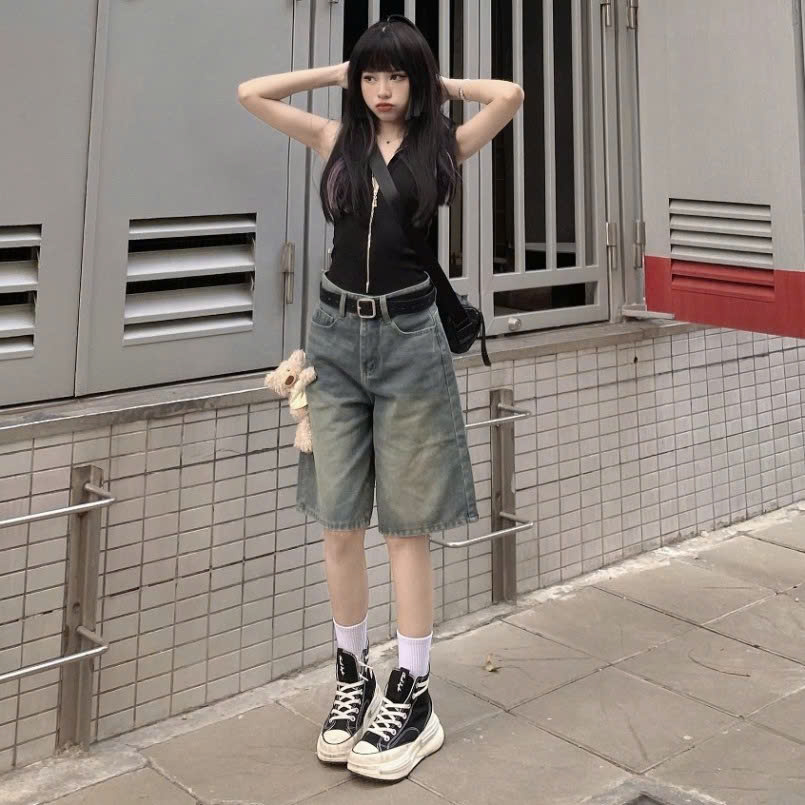 - Kiểu dáng: Quần jean ngố nữ lưng cao ống rộng phối túi trước