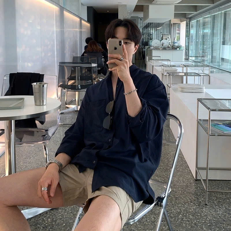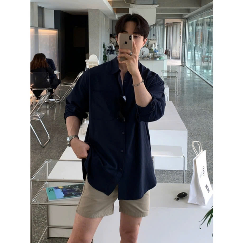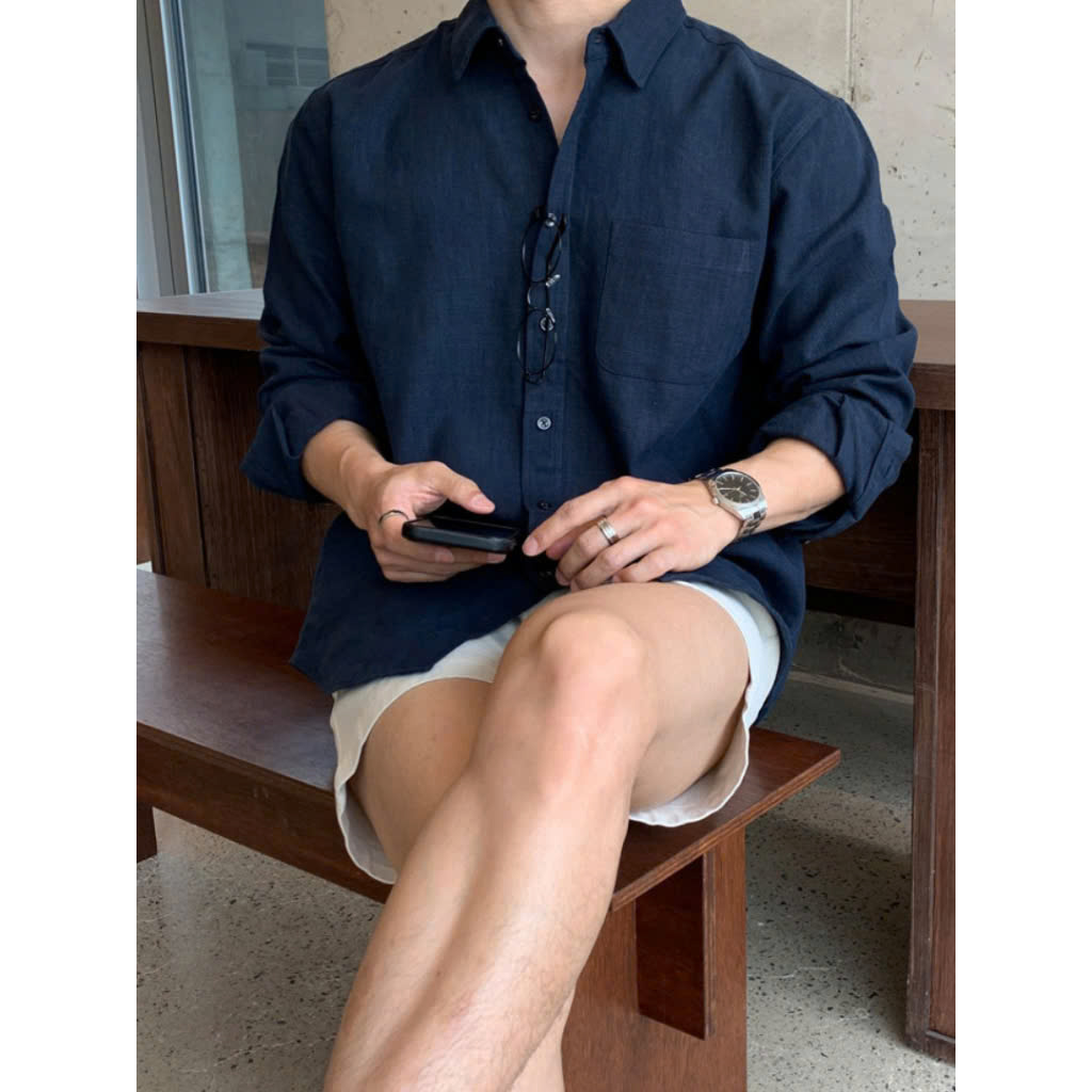 Áo Sơ Mi Nam Xanh Navy Cổ Đức Bẻ Dài Tay Vải LINEN Cao Cấp Đũi Hàn Quốc Oxford Phong Cách Nam Thời Thượng