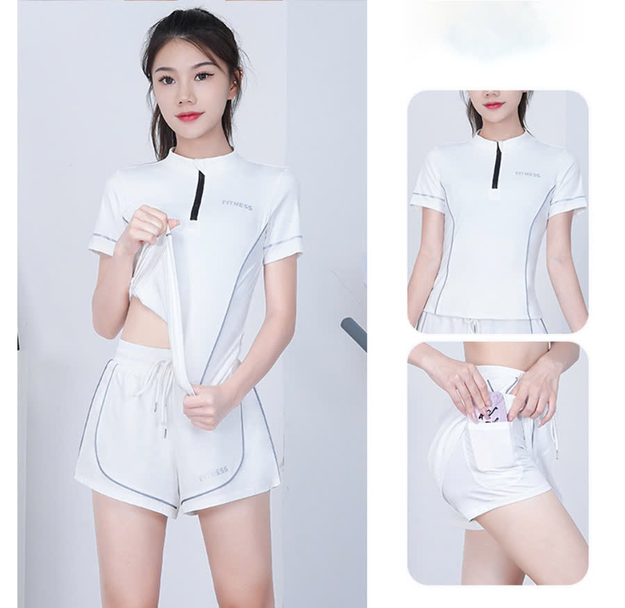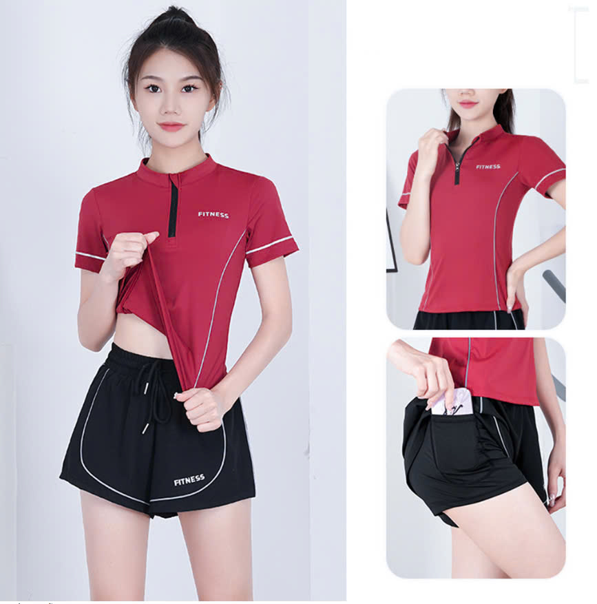 Bộ thể thao nữ tay ngắn, bộ tập gym mùa hè áo khóa kéo quần short 2 lớp có túi đựng